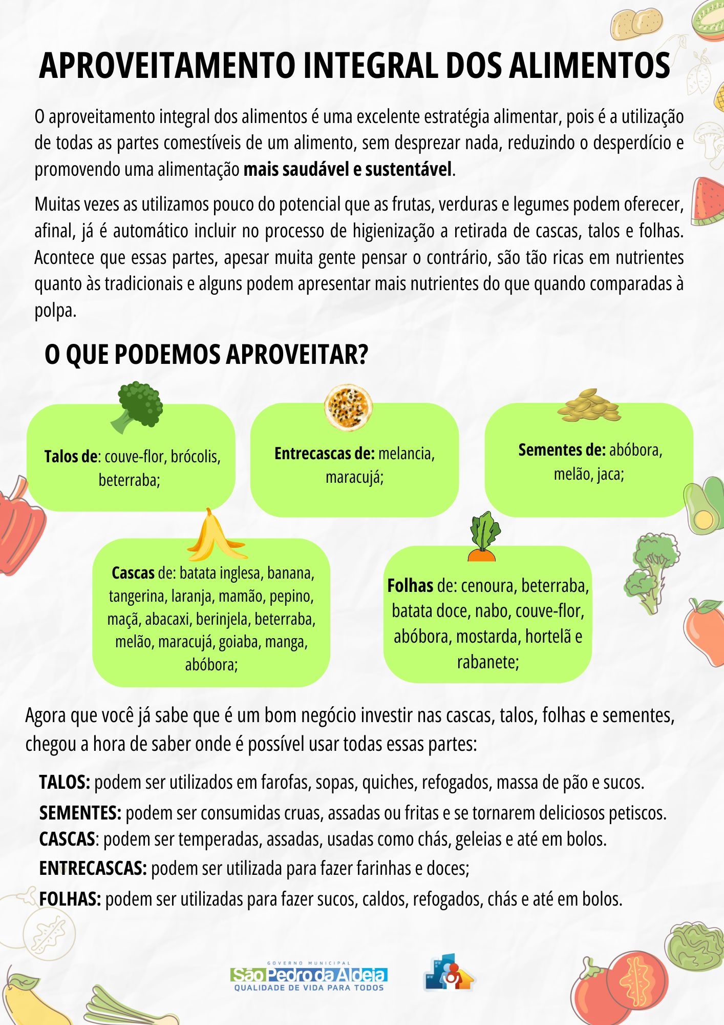 A promoção da alimentação saudável e o acesso a alimentos de qualidade são essenciais, especialmente em contextos de dificuldades econômicas. O aproveitamento integral de alimentos é a utilização completa do alimento, inclusive das partes não convencionais. Após análise do perfil socioeconômico das famílias assistidas no município verificamos um alto índice de insegurança alimentar e obesidade, resultado da carga dupla da má nutrição. Dado o exposto, este trabalho buscou promover a alimentação saudável e o aproveitamento integral dos alimentos através de oficinas culinárias, utilizando ACS como multiplicadores do saber.